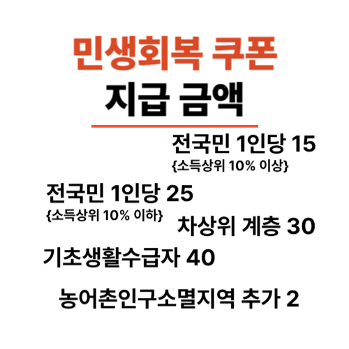 2025 민생회복 소비쿠폰은 총 3조 원 규모의 예산이 편성되어, 약 2,000만 가구를 대상으로 지급됩니다. 이번 지원금은 가구 소득 분위에 따라 차등 지급되며 전국민(상위10%) 15만원, 일반국민 25만원, 차상위 계층 30만원, 기초생활수급자 40만원 그리고 추가적으로 농어촌 인구소멸지역 추가 2만원지 지급되어 최대 52만원을 받을 수 있게 됩니다.